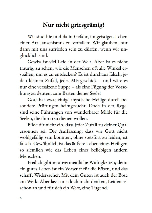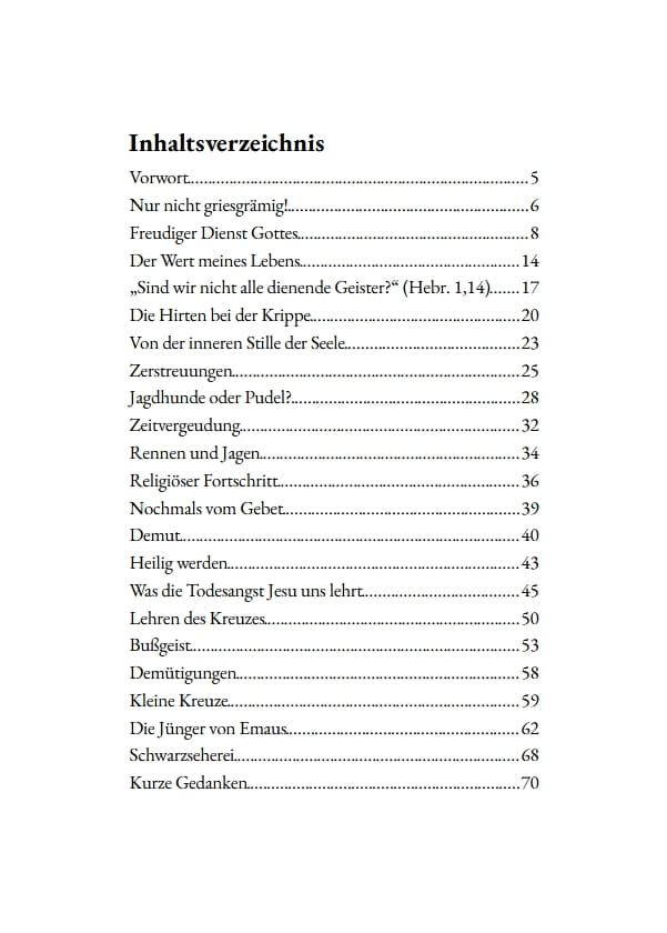 In einfacher Sprache spricht er über Gebet, Demut, Leid und die täglichen Aufgaben des Lebens. Seine Gedanken wollen helfen, falsche Ängste abzulegen, den Blick auf Gott zu richten und den Glauben in Treue und stiller Zuversicht zu leben.