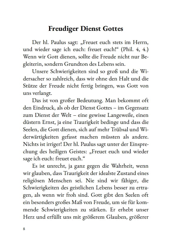 Dieses kleine Büchlein vereint kurze geistliche Gedanken über den Glauben, der von Vertrauen und innerer Freude getragen ist. P. Daniel Considine S. J. zeigt, dass das christliche „Freuet euch“ nicht äußere Leichtigkeit meint, sondern eine zuversichtliche Haltung, die aus dem Vertrauen auf Gottes Güte wächst und auch in Mühe und Leid Bestand hat.